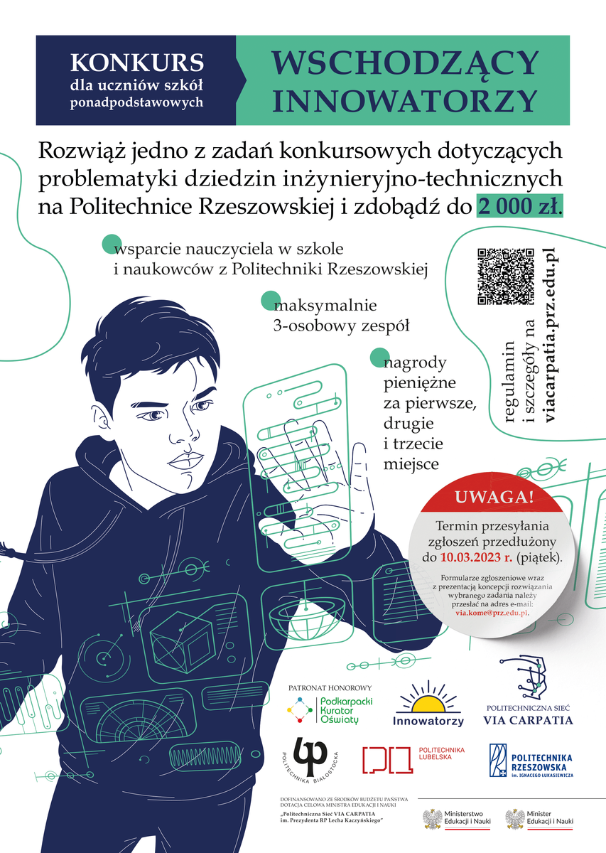 Wydłużamy termin wysyłania zgłoszeń w ramach konkursu Wschodzący Innowatorzy do dnia 10.03.2023 (piątek). Jednocześnie przypominamy, że składanie zgłoszeń odbywa się poprzez przesłanie Formularza zgłoszeniowego wraz z prezentacją dotyczącą koncepcji rozwiązania wybranego zadania, na adres e-mail: via.kome@prz.edu.pl.