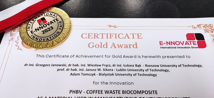 W dniach 30-31 maja w Bydgoszczy odbyły się międzynarodowe targi E-NNOVATE 2023 EDITION: International Innovation & Invention Show w formule stacjonarno-zdalnej. W przedsięwzięciu został zaprezentowany wynalazek pn. BIOKOMPOZYT POLIMEROWY PHBV-ZUŻYTE FUSY KAWY JAKO MATERIAŁ STOSOWANY W PRODUKCJI WYROBÓW UŻYTKOWYCH, za który otrzymano Złoty Medal Targów w kategorii Zero Waste Technologies. Proponowane rozwiązanie/wynalazek jest rozwijane w ramach projektu INNOSPIN 3/2023, finansowane przez Politechniczną Sieć VIA CARPATIA imienia Prezydenta RP Lecha Kaczyńskiego.